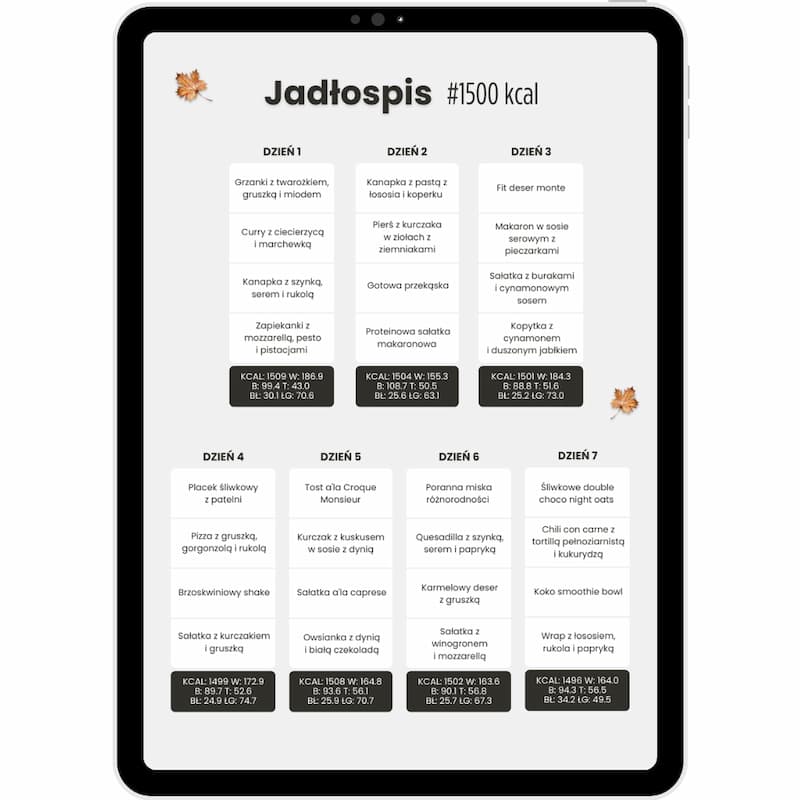 - 7-dniowy jadłospis (4 posiłki dziennie) z aż 7 wariantami kalorycznymi – od 1500 do 2100 kcal.