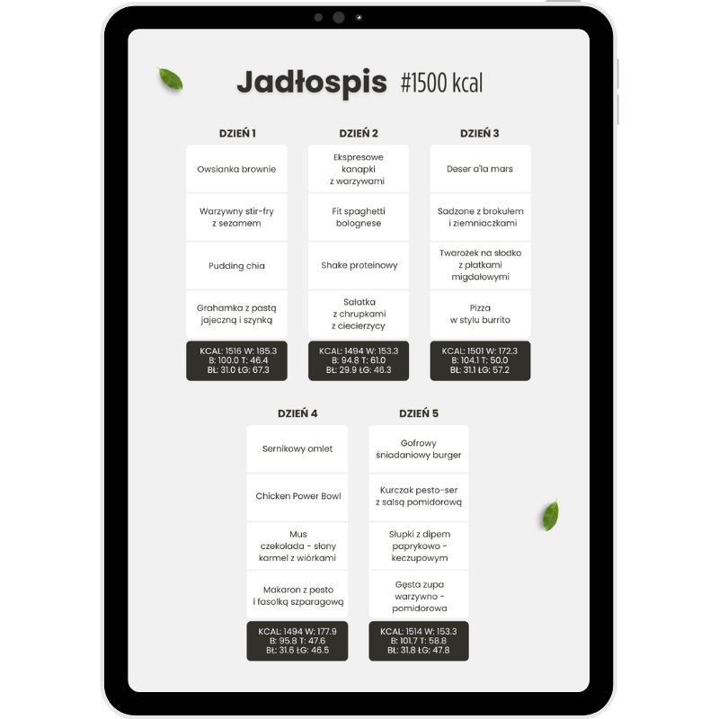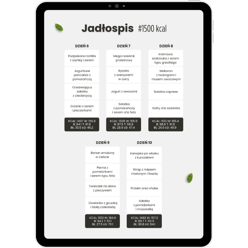 📖 10 dniowy jadłospis z 4 posiłkami dziennie + wszystkie  7 kaloryczności diety (od 1500 do 2100 kcal) – w sumie 40 przepisów, które się nie powtarzają!